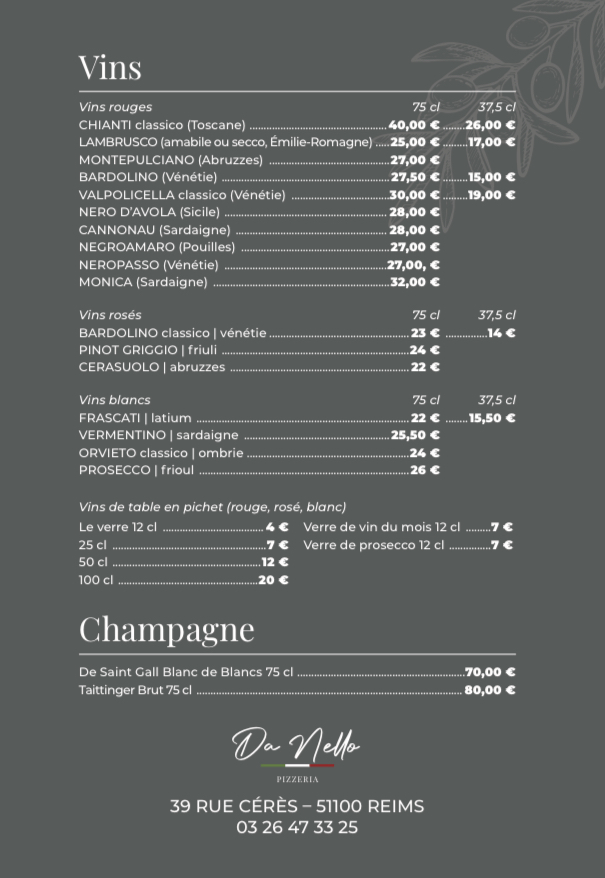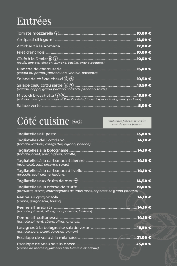Da Nello’s menu leaves a satisfying final impression, striking a balance between comforting Italian tradition and well-executed simplicity. The Assiette Charcuterie sets the tone with a generous and flavorful selection, perfect for sharing, while the Pain Italien complements it beautifully with its fresh, rustic quality. Moving into the mains, the Pâtes Gorgonzola stands out for its rich, creamy depth without overwhelming the palate, and the Pâte Carbonara delivers a classic interpretation that feels both authentic and indulgent. Altogether, the menu reflects a thoughtful curation of Italian staples, where each dish contributes to a cohesive and enjoyable dining experience that feels both approachable and satisfying.